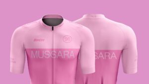 Como en los últimos años, la marca italiana Santini es la encargada de fabricar el maillot. Una prenda de alta calidad que combina comodidad y rendimiento y que mantiene el color rosa como protagonista.