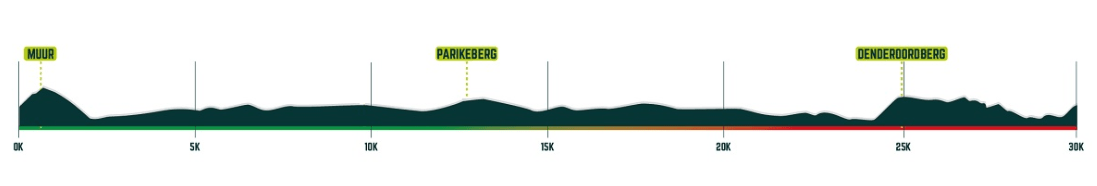 En total serán 177, 8 kilómetros de recorrido que se repartirán primero en 24, 3 km para luego dar paso al circuito de 30 kilómetros al que tendrán que dar cinco vueltas. Serán tres las cotas que tendrán que superar en cada una de los cinco giros con la presencia del Muur (1,1 km al 7,8%), Parikeberg (1 km al 4,2%) y Denderoordberg (1 km al 5,5%).
