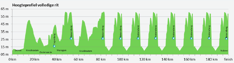 Se trata, además, de una prueba que no recorre, como casi todas aquellas que actúan como previa o preparación de cara a la Vuelta a Flandes, las grandes colinas de Flandes, sino que sólo dos de ellos, el Tiegemberg y el Nokereberg (que se sube en nueve ocasiones) conforman el recorrido que, tras 84 kilómetros entra en un circuito al que se darán siete giros para completar los 192,3 kilómetros de competición.