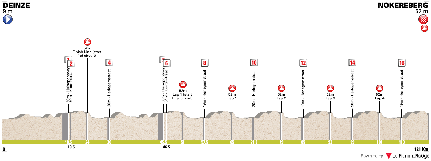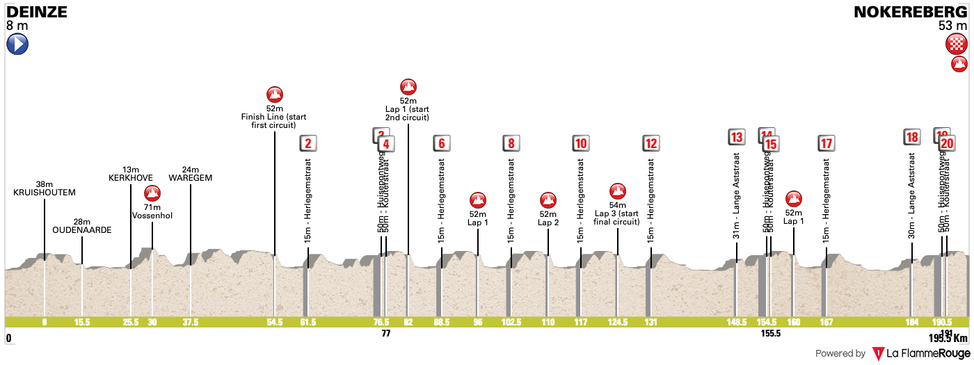 Salida muy rápida del mercado central de la localidad belga de Deinze. Apenas con diez kilómetros transcurridos fueron suficientes para formar la primera fuga del día con David Boucher (Tarteletto-Isorex), Axel Journiaux (Direct Energie), Yoann Offredo (Wanty-Groupe Gobert), Otto Vergaerde (Corendon-Circus) y Mattia Viel (Androni-Sidermec), a quienes el grupo les dio cierta ventaja inmediatamente. La situación se mantuvo controlada en todo por el Deceuninck – QuickStep permitiendo hasta llegar al primer circuito en Nokere, donde el grupo decidió entonces comenzar a recuperar la desventaja.