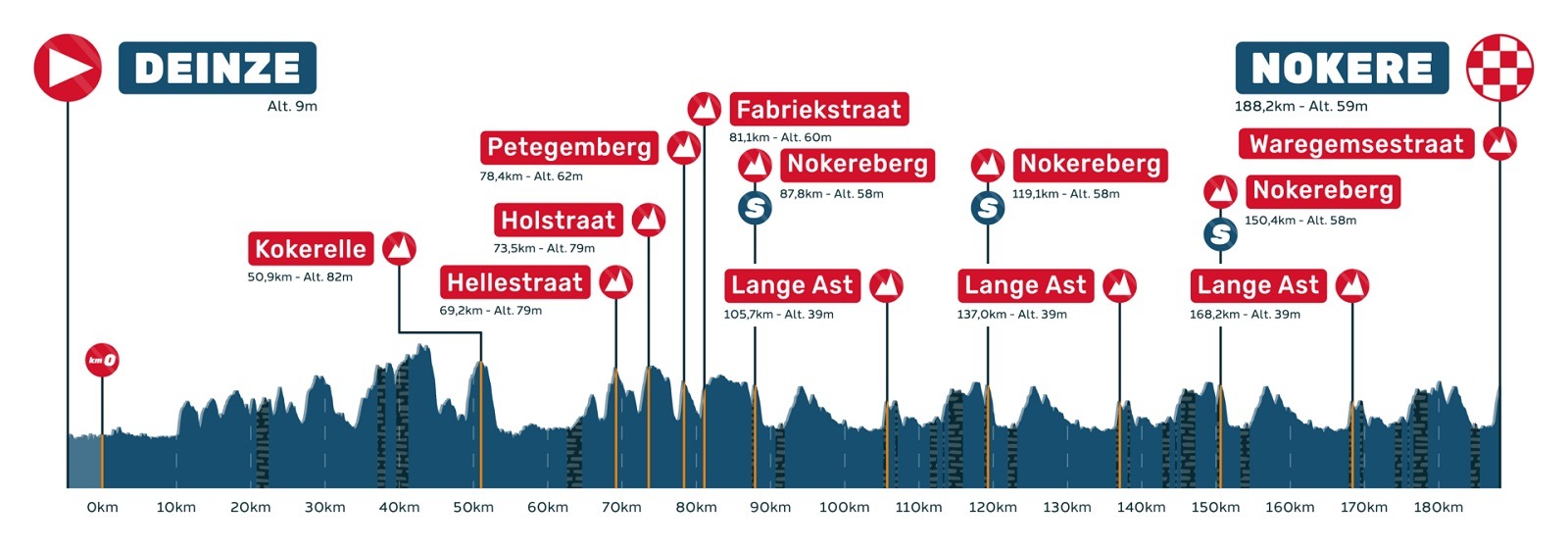 Los ciclistas corredores recorrerán parte del circuito en sentido contrario al tradicional, acercándose a la meta desde Waregemsestraat. Una novedad que los organizadores han introducido para hacer más seguros los últimos kilómetros, a menudo escenario de accidentes y caídas, pero que en cualquier caso no debería cambiar mucho a nivel técnico. Casi con toda seguridad, los duros velocistas como Tim Merlier, ganador de las tres últimas ediciones, volverán a luchar por la victoria.