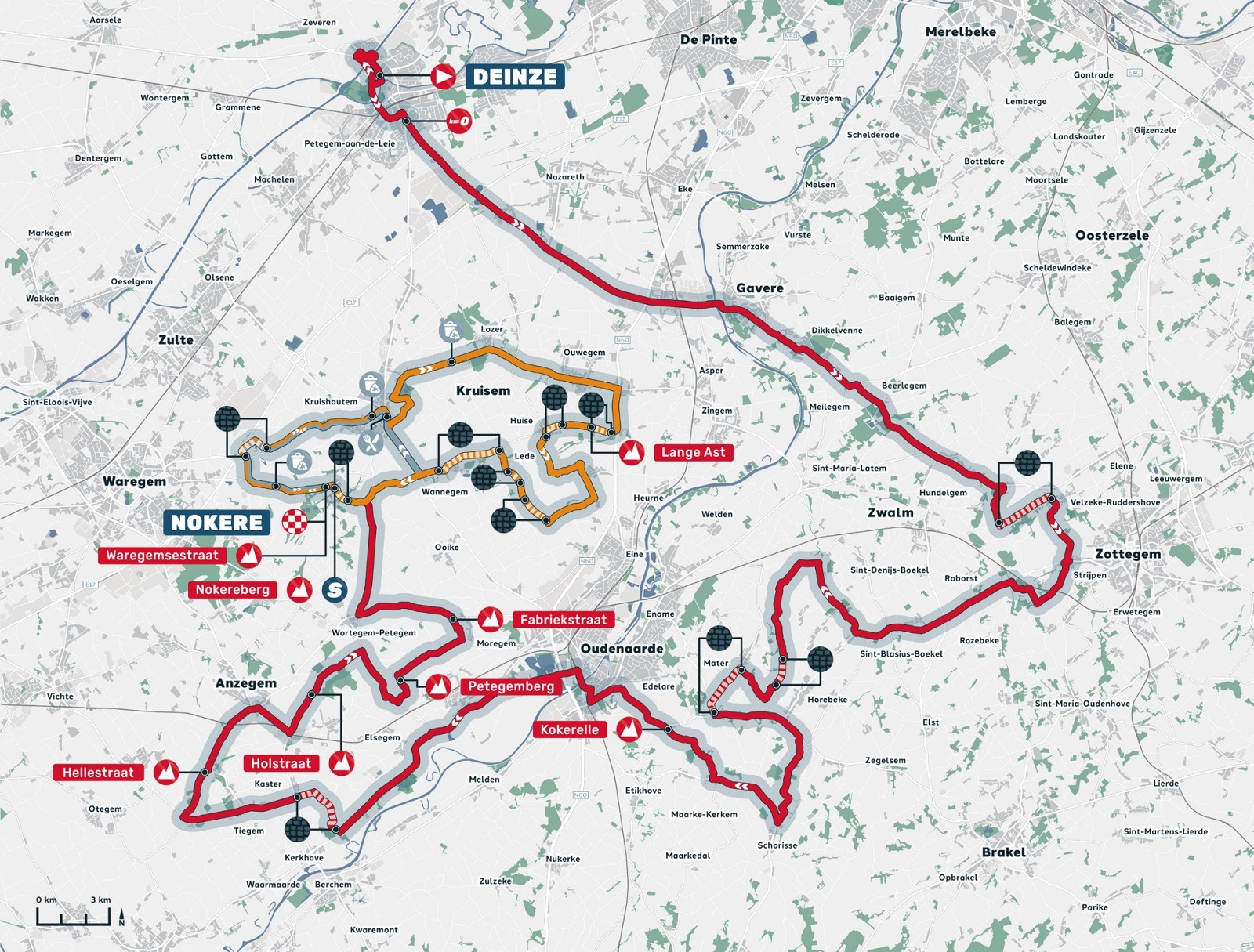 El Nokereberg se mantiene en el recorrido y se utilizará tres veces durante el trazado local. La salida seguirá dándose desde Deinze. El año pasado, Tim Merlier (Soudal-Quick Step) y Lotte Kopecky (SD Worx) ganaron la carrera 1.Pro en los adoquines cuesta arriba de Nokere.