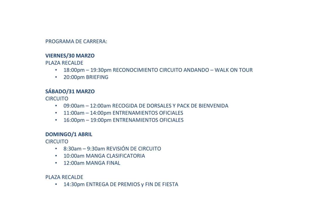 La acción arrancará el sábado 31 con la disputa de los entrenamientos oficiales, que tendrán lugar a lo largo de la mañana y la tarde; mientras que la competición se celebrará ya en la jornada del domingo 1. A las 10:00 horas comenzará la manga clasificatoria y a las 12:00 horas a la manga final.