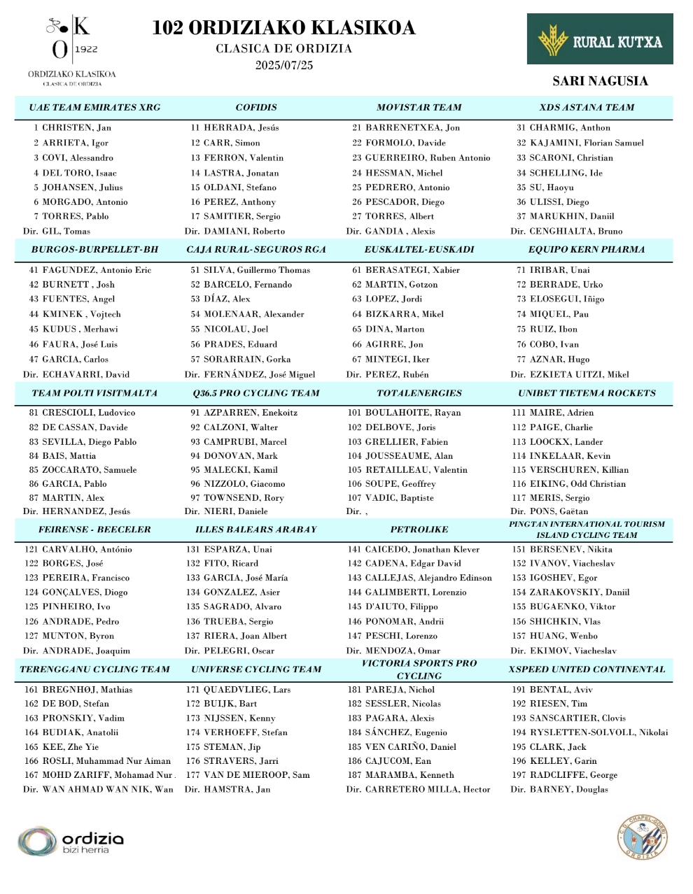 Clément Alleno (Burgos): “La carrera ha sido muy rápida todo el día. El circuito de este año me iba perfecto, ya que había un tramo llano hasta meta tras la bajada. En las primeras vueltas fuimos bien situados delante en el puerto. Tuve un pequeño error en la segunda vuelta, cuando se cortó el grupo en el descenso, pero pude volver pronto al pelotón. En cada subida tuvimos una buena posición gracias al trabajo de Vojtech y Josh. En la última se fue rápido y José Luis y yo aguantamos en el primer grupo. Cogí una buena posición en la bajada para no cortarme y disputar el sprint. Arranqué a 500 metros y lancé el sprint a tope en los últimos 200. Estoy contento con este quinto puesto. Creo que podría haberlo hecho incluso mejor, pero el sprint fue corto. Tengo buenas piernas y estoy contento con este resultado. Durante el mes de junio hice tres semanas de trabajo en altitud en Andorra como preparación para Qinghai, donde también corrimos a mucha altitud. Allí en China me encontré muy bien, con muy buenas piernas, y pude terminar octavo en la general. Al llegar a casa tuve pocos días de descanso, pero recuperé bien. Aproveché esas semanas en altitud para buscar un buen resultado en estas clásicas. Hice el 12º en Terres de l’Ebre. Estaba un poco decepcionado, porque creo que podía haberlo hecho mejor. Hoy en Ordizia el circuito me iba mejor. Tengo buenas piernas estas semanas y espero hacerlo bien el domingo en Castilla y León, buscando otro top-10 o top-5”.