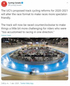 Las reformas de ciclismo en pista propuestaspor la UCI para 2020-2021 alterarán el formato de carrera para que las carreras sean más amigables para los espectadores. La pista ahora se correrá en sentido contrario a las agujas del reloj para hacer las cosas un poco más difíciles para los ciclistas que están «demasiado acostumbrados a correr en una dirección«. Este era el jocoso tuit de Cycling Canada en la jornada de anteayer, el April Fool’s day, equivalente en muchos países a nuestro Día de los Inocentes.