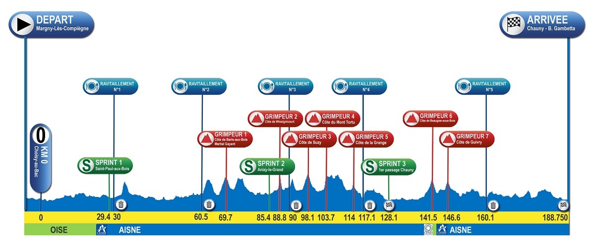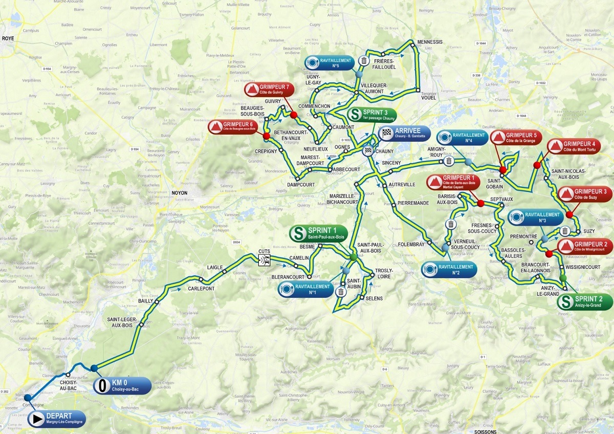 La carrera mantendrá la salida en Margny-les-Compiègne y la llegada en Chauny, donde Arnaud Démare se impuso en 2024. Los corredores afrontarán 188,7 kilómetros con siete cotas cortas en el trayecto, la última situada a 42 kilómetros de meta, antes de un desenlace que apunta nuevamente a una llegada masiva.
