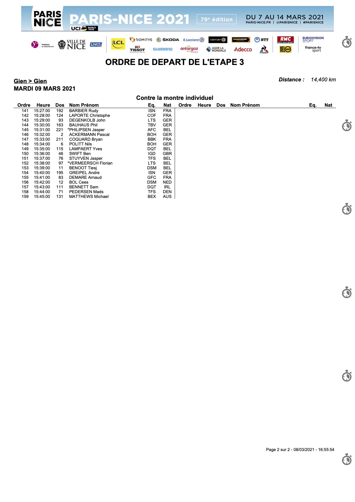 Stefan Bissegger ha ganado la contrarreloj individual de la tercera etapa de la París-Niza. El joven suizo del EF Education-First fue más rápido que los especialistas en contrarreloj por delante de Rémi Cavagna (Deceuninck-Quick Step), por tan sólo 83 centésimas, y Primož Roglič (Jumbo-Visma) en un recorrido de 14,4 km. Bissegger, además, se enfundó el maillot amarillo de Michael Matthews. El suizo lidera con el escaso margen mencionado sobre Cavagna la general y por seis segundos sobre el esloveno, ahora tercero, cuando la carrera afrontará la segunda parte con perfiles que benefician las aspiraciones  del doble ganador de la Vuelta a España y los escaladores puros.