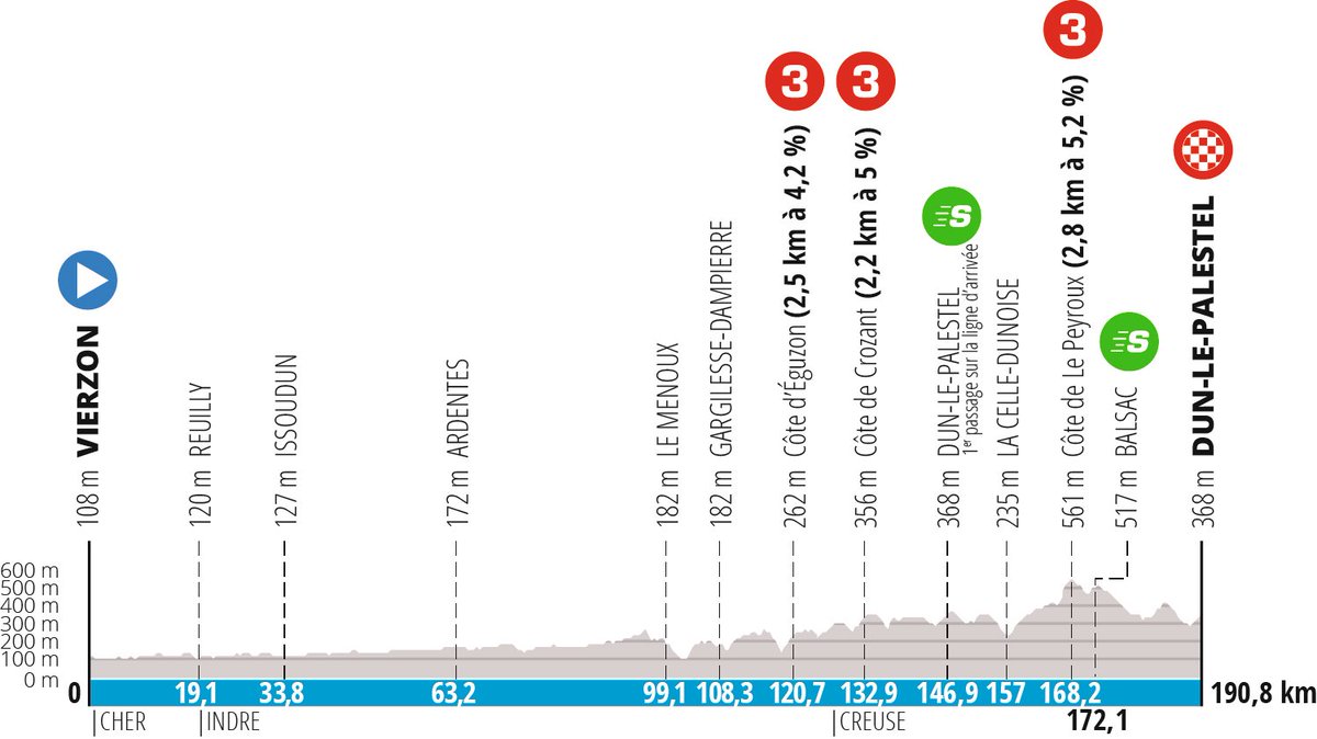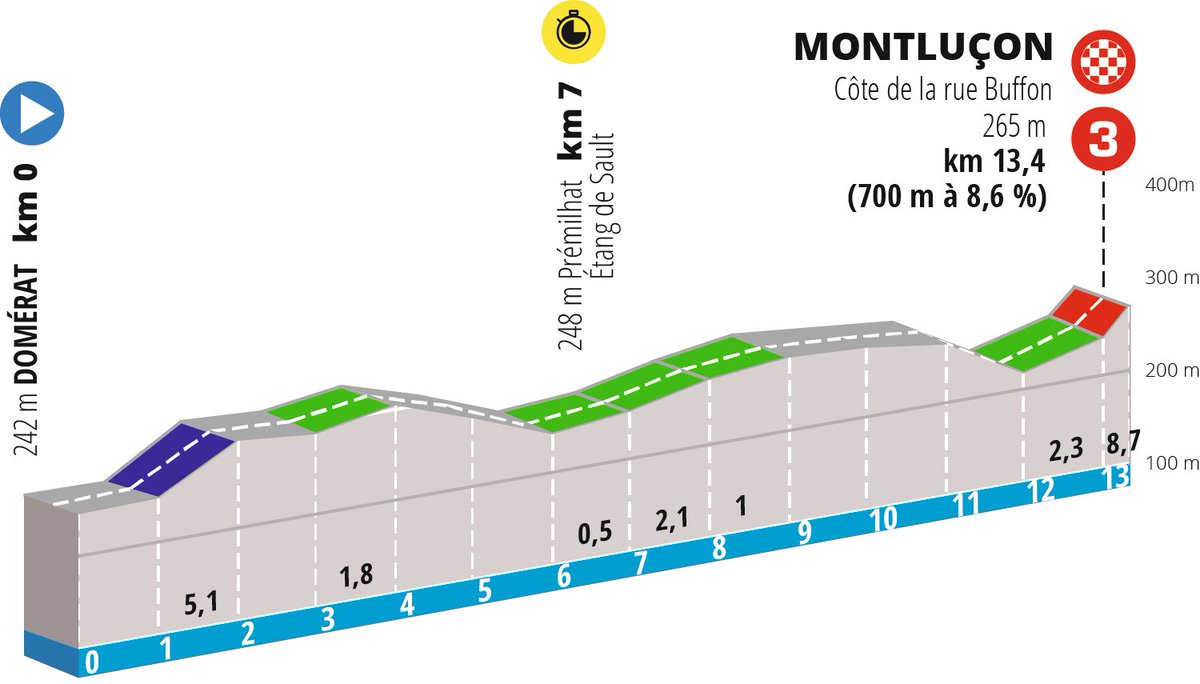 Allier acogerá la tradicional contrarreloj individual de mitad de semana, un recorrido corto y accidentado de 13,4 km entre Domerat y Montlucon y un último tramo empinado con porcentajes que alcanzan el 14 por ciento de desnivel.