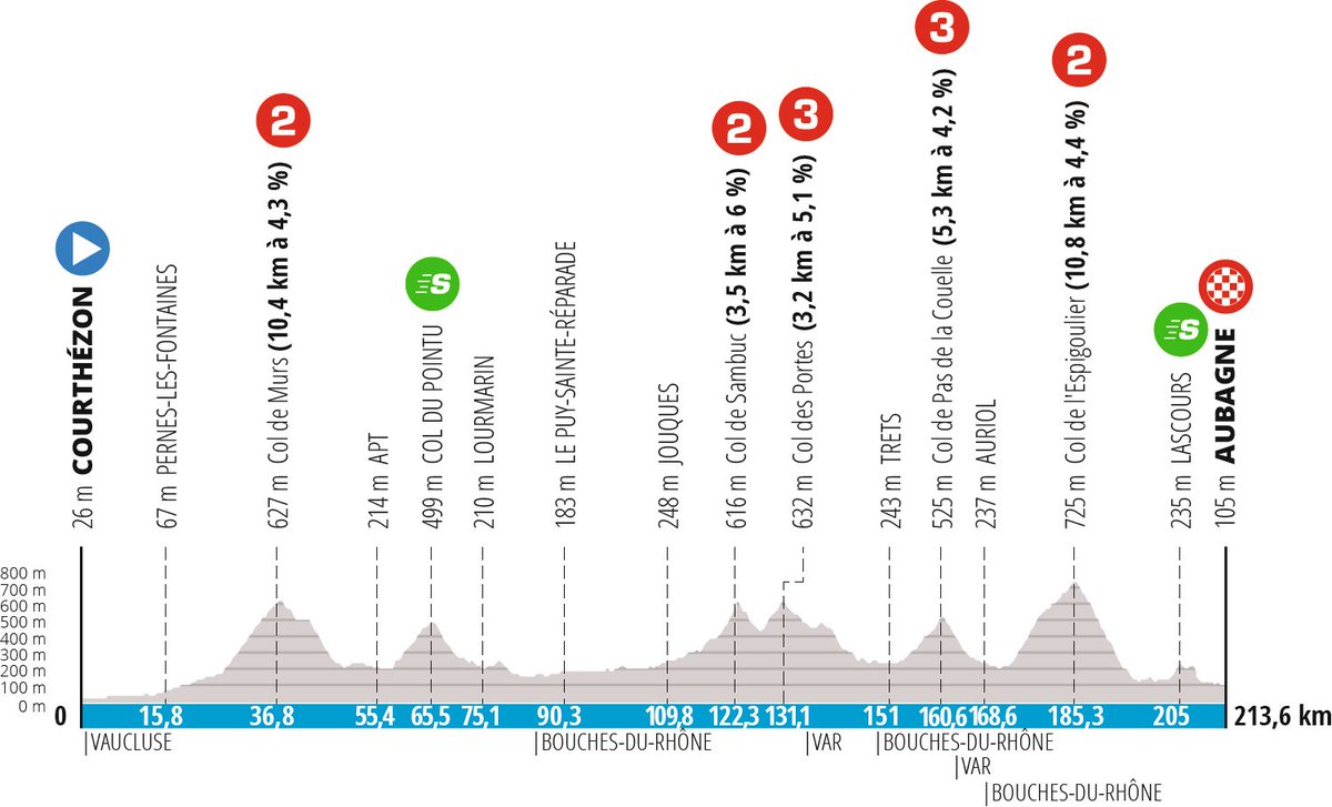 La carrera se dirigirá al Mediterráneo el viernes para la etapa más larga de este año, entre Courthezon y Aubagne, a las afueras de Marsella. Con otros 2.900 metros de elevación y el ascenso del complicado puerto de Espigoulier poco antes del descenso final, la etapa será un calentamiento perfecto para un último fin de semana tradicionalmente exigente.