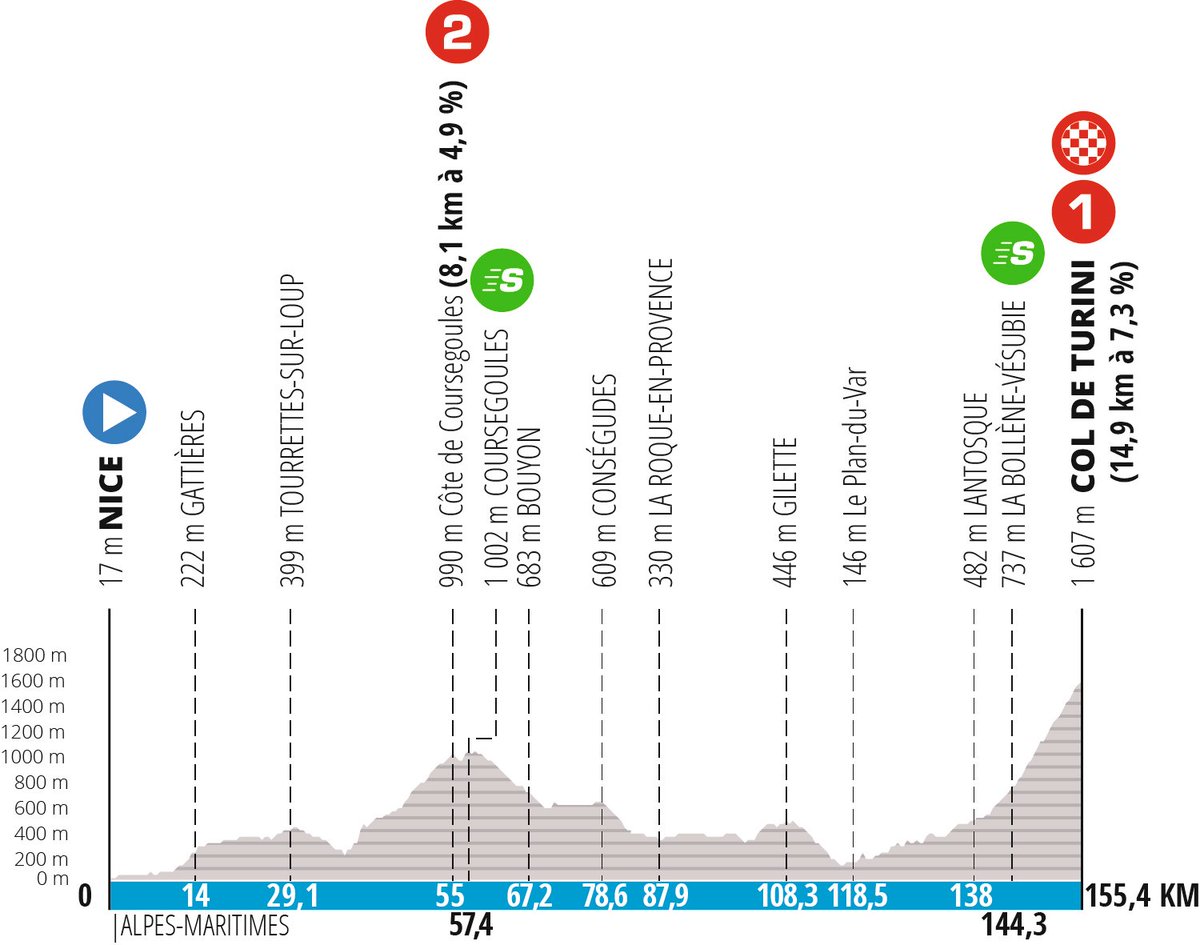 En los últimos años, la París-Niza ha ido a la altitud el sábado y la carrera vuelve al puerto de Turini (14,9 km a 7,3%) tres años después de una etapa que coronó a dos colombianos, Dani Martínez para los honores del día y Egan Bernal para la general. La última subida será el punto álgido de la jornada, ya que ese día sólo hay una subida menor, la de Coursegoules.