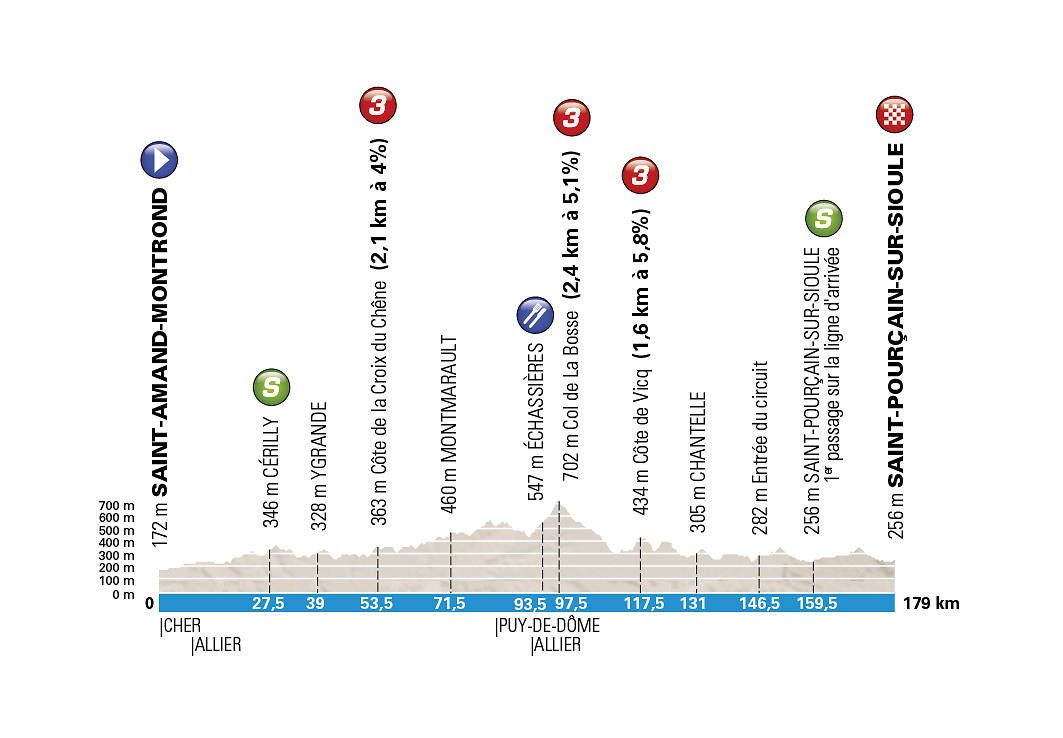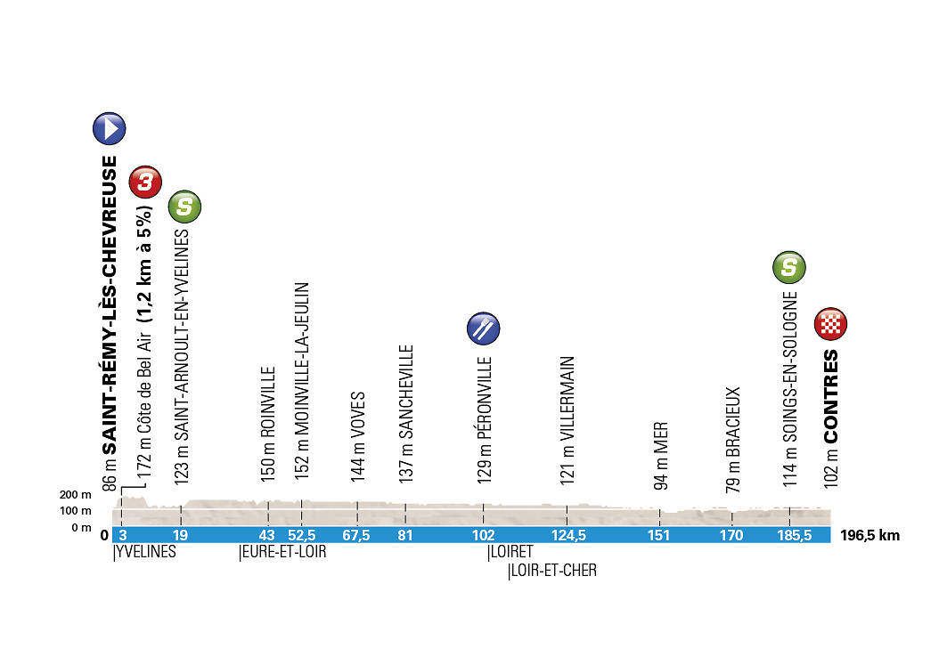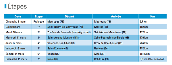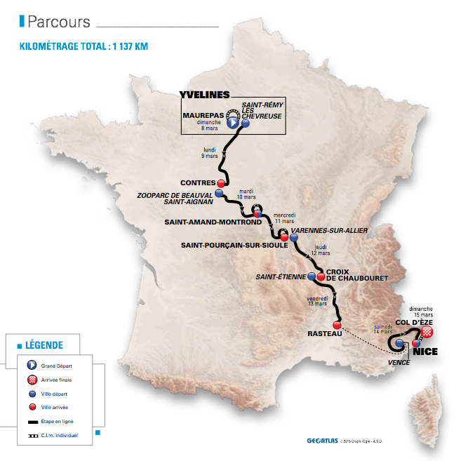 La París-Niza (PN) 2015 comenzará con un prólogo de 6,7 kms. en Maurepas -orden salida tras los perfiles-, a tan solo 40 al oeste de la capital francesa, que dará paso a dos etapas totalmente llanas con finales en Contres y Saint-Amand-Montrond en el corazón de Francia, conectando con una tercera en Saint – Pourçain-sur-Sioule en el que atravesarán dificultades montañosas en el ecuador de la misma pero sin gran trascendencia, jornadas que darán forma a un primer bloque con presumible protagonismo de los velocistas.