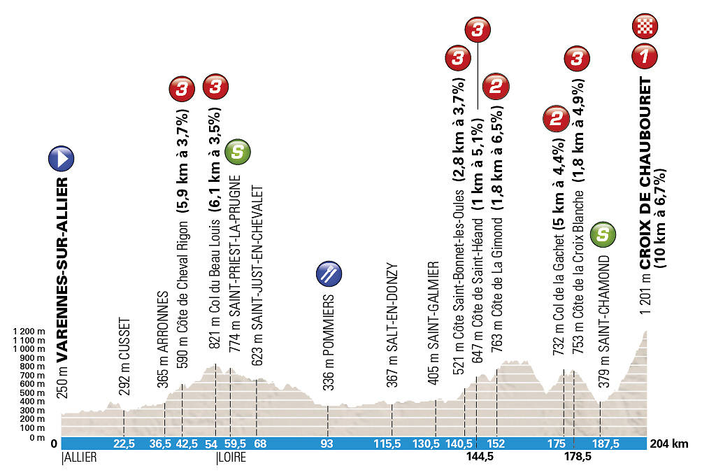 Al día siguiente el grafismo del libro de ruta cambia radicalmente, el jueves dia 12 llegará la etapa reina y asimismo como el primer contacto con la montaña entre Varennes-Sur-Allier y la Croix de Chaubouret de 204 kms, en la estación de esquí perteneciente a los Munts du Pilat de los Alpes. Etapa más larga que cuenta con siete trampas previas al puerto final, siete cotas perfectas para ataques sin cuartel en un tobogán continuo que verá en la rampas de un 1ª categoría, de 10 kms y 6,7% de pendiente media, el desenlace a un día que evoca al miticismo de la media montaña de Los Vosgos.