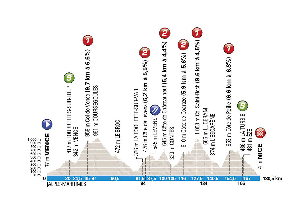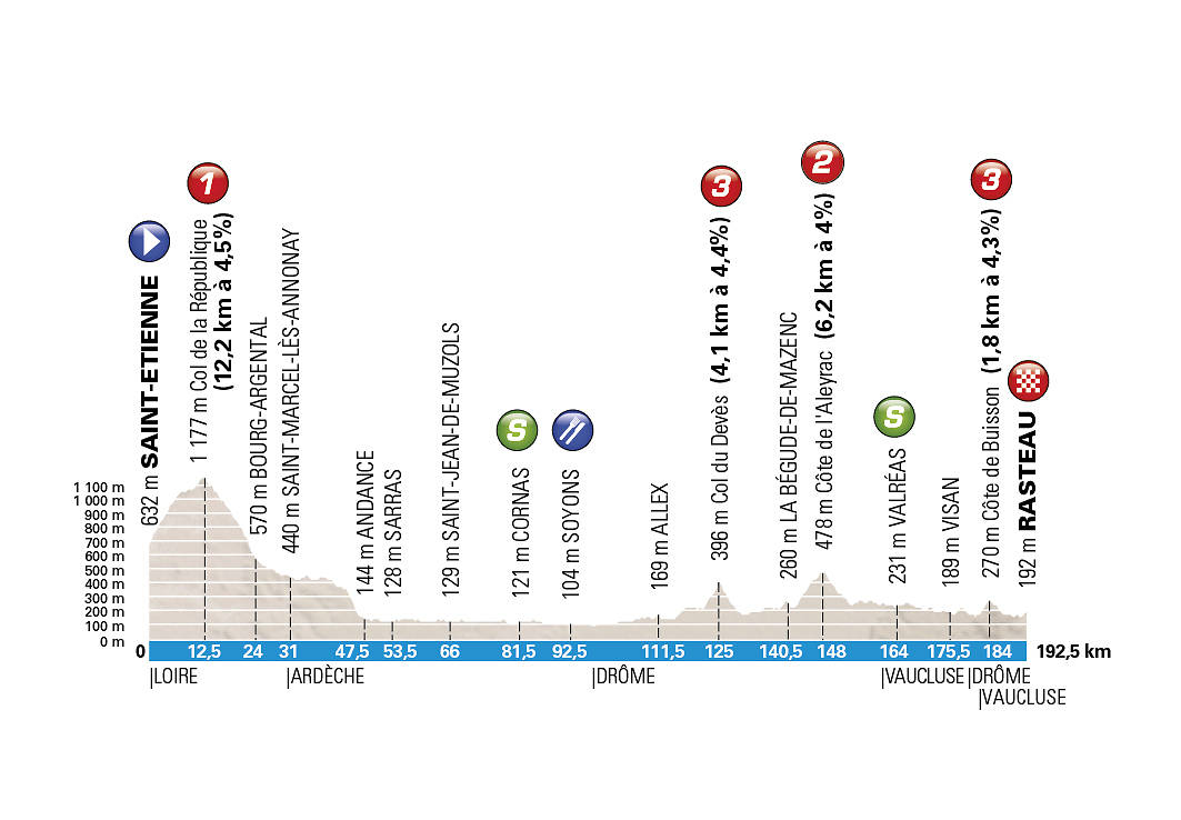 La 5ª etapa pone su punto de partida en Saint Étienne rumbo a Rasteau, con el Col de la Rèpublique (1ª) nada más salir pero sin más dificultad, aunque el último kilómetro es bastante duro con una pendiente media del 4,4%, cita apropiada para recuperar fuerzas antes de afrontar el dúo de etapas decisivo. Primero con otro homenaje a las piernas de 181,5 km. entre Vence y Niza, donde afrontarán seis ascensiones entre tres puertos de 2ª categoría y otras tantas de 1ª: el Col de Vence (9,7km. al 6,6%) en primer termino, y enlazados el Col de Saint Roch (9,6km al 4,5%), la Côte de la Peille (6,6km al 6,8%) con el paso por La Tubie y el peligroso descenso posterior hacia la tradicional meta del paseo marítimo nizardo.