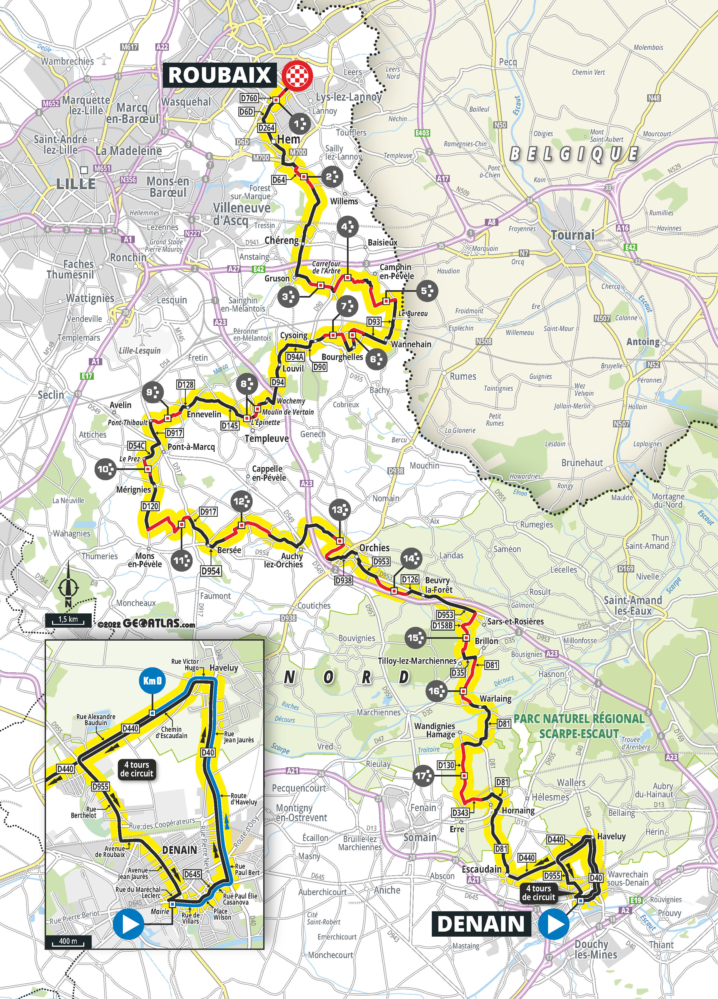 En el circuito inicial de Denain, con 4 vueltas por cubrir, los primeros atacantes inician una intensa batalla por la escapada. Gaia Masetti (AG Insurance), Leonie Bos (Parkhotel Valkenburg), Amalie Lutro (Uno-X) y Katie Clouse (Human Powered Health) son las primeras corredoras que consiguen escaparse. Tanja Erath (EF Education-Tibco-SVB) forma un grupo de 5 mujeres al frente en el km 6.