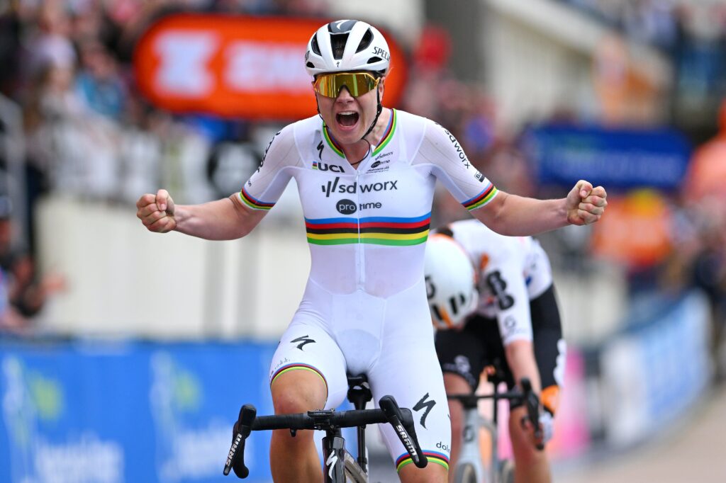 Lotte Kopecky: «Es una locura. Ese era realmente el gran objetivo de la temporada de clásicas de primavera. Y hacerlo así, en equipo… Porque tengo que decir que el equipo estuvo muy bien hoy (sábado). Durante los primeros 50 kilómetros, estuvimos juntos todo el tiempo, hicieron un gran trabajo. Y al final, todavía quedaba Lorena Wiebes en el grupo grande. Así que realmente fue una gran carrera por equipos». Ha sido una gran carrera de equipos que todavía nos ha tocado sublimar en una final que era complicada de jugar tácticamente. Obviamente, quería hacer la carrera difícil, era la única opción para mí. Pero llegó hasta aquí, en el velódromo, y sabíamos que había corredores rápidos que se adaptaban bien a él. Sé que no soy el más rápido, pero tampoco soy el más lento… Hubo un momento en el que pensé: «Oh, esto puede salir mal». Pero tenía que mantener la calma, y el hecho de tener un poco de experiencia en la pista ciertamente me ayudó mucho».
