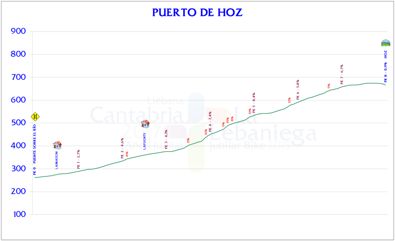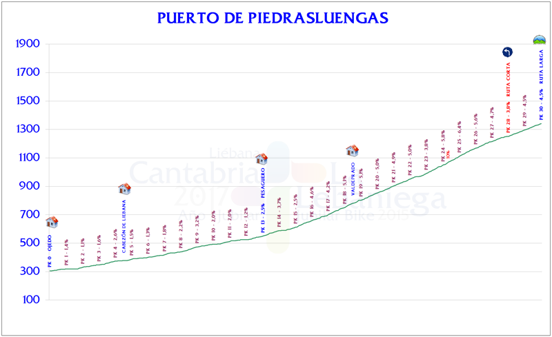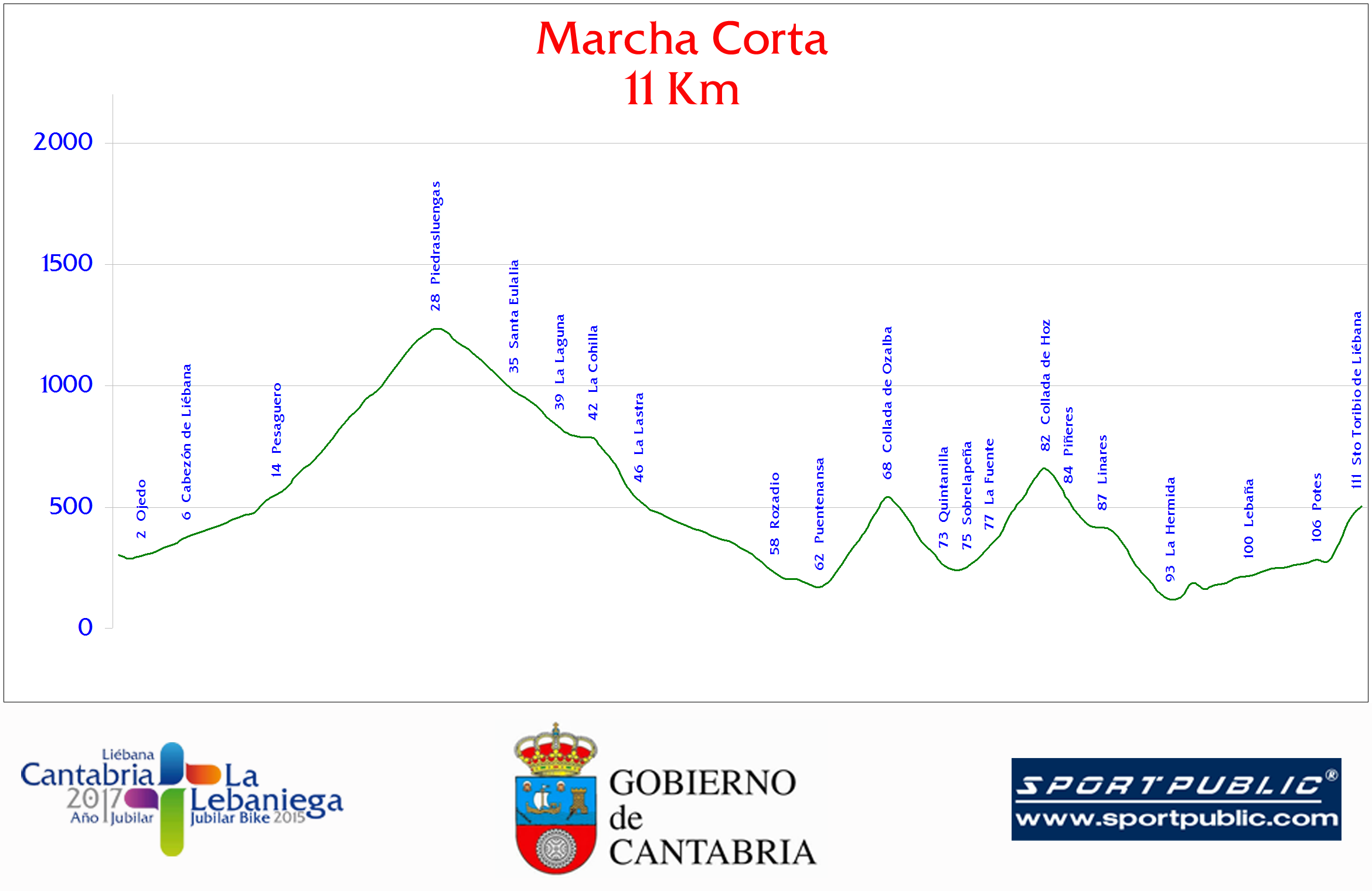 El recorrido corto, de 111 kilómetros, tendrá su salida en la Plaza de Potes a las 9.30 horas. Y antes de completar el trazado en Santo Toribio de Liébana, los participantes deberán ascender los puertos de Piedrasluengas (km. 28) La Cohilla (km. 42), Collada de Ozalba (km. 68), Collada de Hoz (km. 82) y La Hermida (km. 93), con el siguiente PERFIL: