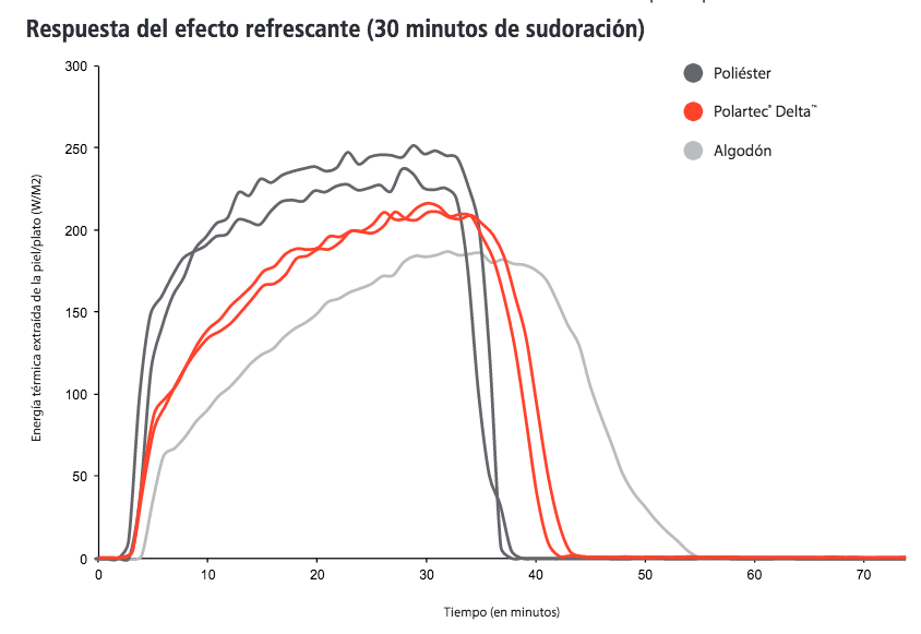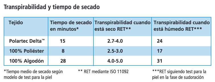 Ellos crean tejidos con hilos y no utilizan piezas metálicas. Así que este tejido está compuesto de hilos hidrófobos siguiendo la estructura de un radiador lo que permite prolongar el frescor en la piel. Los hilos absorben la humedad y la distribuyen alrededor del tejido, consiguiendo el mismo efecto refrigerante que el radiador de un coche. El innovador Polartec® Delta™ reparte la humedad en todo el tejido para que la piel se beneficie del efecto refrescante de la evaporación. Las zonas hidrófobas están creadas con hilos sintéticos y con una estructura de punto especial para proporcionar la máxima transpirabilidad y un secado rápido.