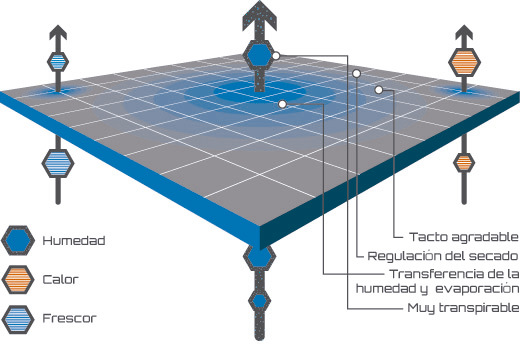 • Transporte superior de la humedad al exterior. Los hilos hidrófobos prolongan la respuesta natural de la piel y su efecto refrescante al evaporar el sudor