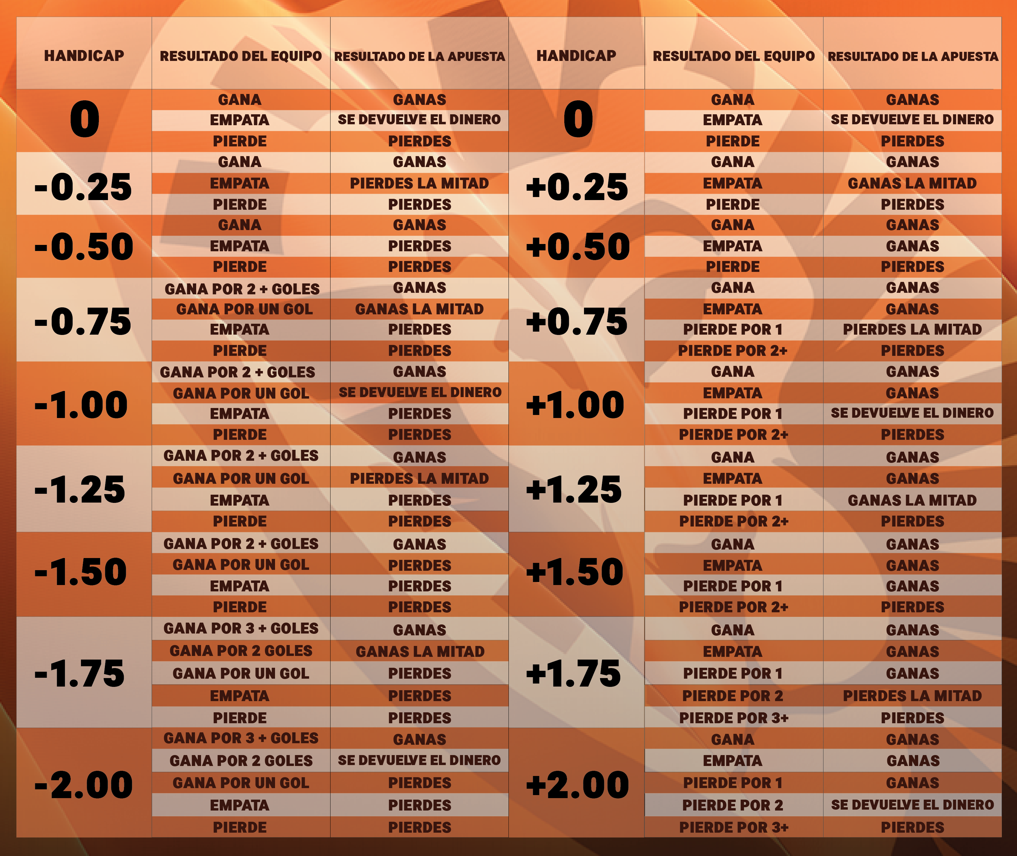No es necesario que entiendas la tabla de manera inmediata pero apenas logres entender los términos y la mecánica del hándicap asiático, podrás disfrutar de este método de apuesta que tiene bajo riesgo y que te ofrece una manera equilibrada de jugar y apostar.