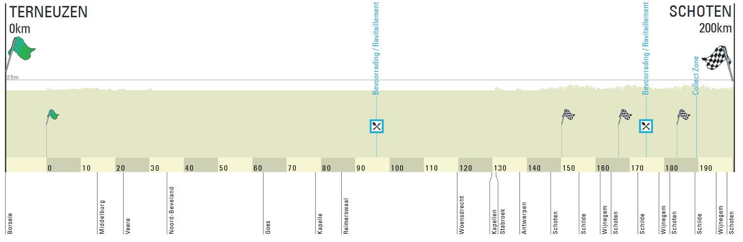 De Bie (Vérandas), Van Schip (Roompot), Rickaert (SVB), Van Keirsbulck (Wanty) y Cataford (UHC) tuvieron algo más de éxito y cobraron hasta 3 minutos con una parte del pelotón. La otra, rezagada por una caída en el seno del gran grupo e integrada por unas 35 unidades, circulaba con cerca de medio minuto de desventaja, con hombres como Groenewegen, Roosen y Jansen (LottoNL-Jumbo), Démare (Groupama), Martinelli (Quick-Step), Tony Martin (Katusha), Knees y Stannard (Sky), Curvers y Hofstede (Sunweb) o Minali y Houle (Astana). Para no perder más tiempo, decidieron ignorar un paso a nivel -con las barreras ya bajadas- en Krabbendijke y fueron descalificados.