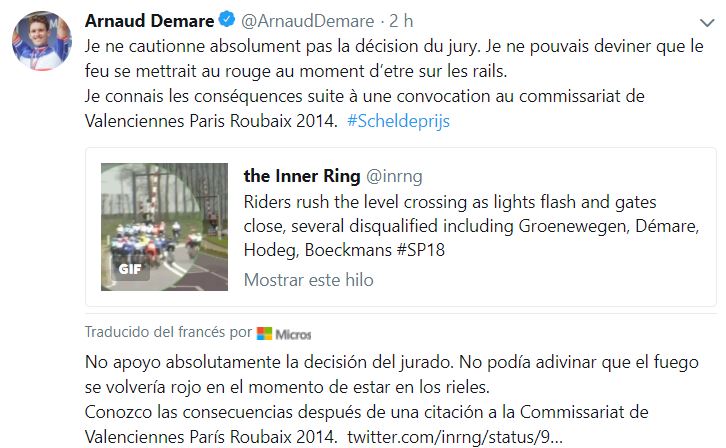 El francés del Groupama-FDJ ha expresado su disconformidad con la descalificación: «No apoyo en absoluto la decisión del jurado. No podía adivinar que el semáforo se pondría en rojo en el momento de estar sobre los raíles. Conozco las consecuencias de una citación en la Comisaría de Valenciennes, París Roubaix 2014″. Démare alude a la célebre imagen -fue en 2015- de ciclistas cruzando las vías con las barreras bajadas, tras lo cual la UCI modificó la redacción de la norma el 29 de enero de 2016 (ver normativa).