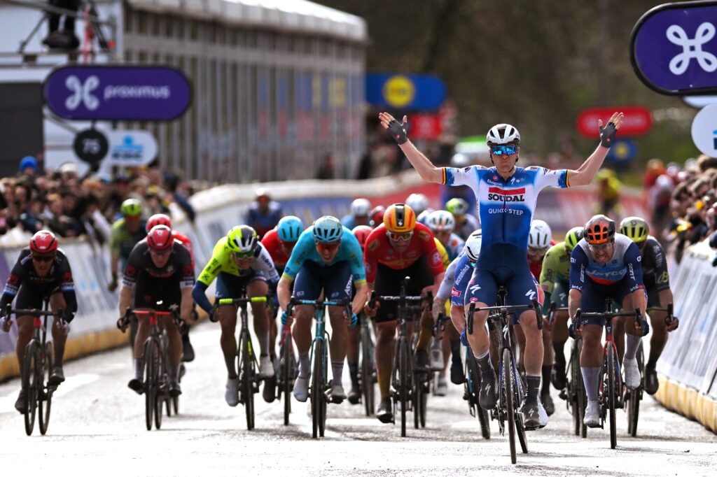 Philipsen doblegó a Merlier en la 2ª etapa de Tirreno Adriático, así como en la Clásica Brujas-De Panne. Por el otro lado, Merlier batió al de Alpecin en la Nokere Koerse, igualando el balance con este triunfo -el 6º de la temporada- al esprint. La clave del desenlace al esprint estuvo en el descontrol que el equipo Alpecin vivió. Jasper Philipsen perdió la rueda de su lanzador, quedándose encerrado, sin ninguna capacidad de reacción. A falta de 150 metros encontró hueco. Pero era demasiado tarde. Su arrancada solamente le permitió superar a Dylan Groenewegen (3º) y Cees Bol (4º), sin tener ninguna opción de llegar a la altura de un Tim Merlier que hasta se permitió el lujo de levantar los brazos antes de cruzar la línea de meta.