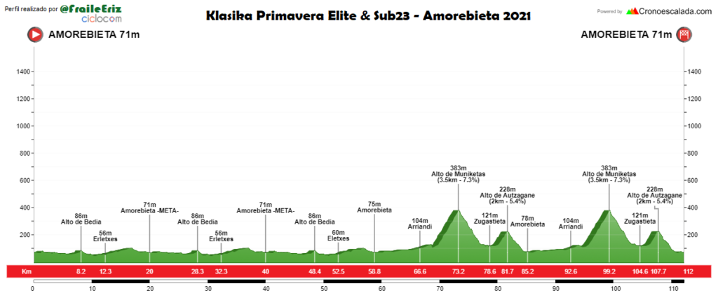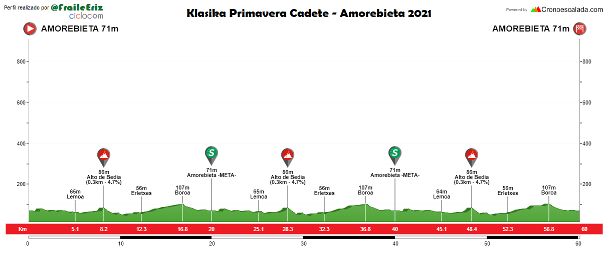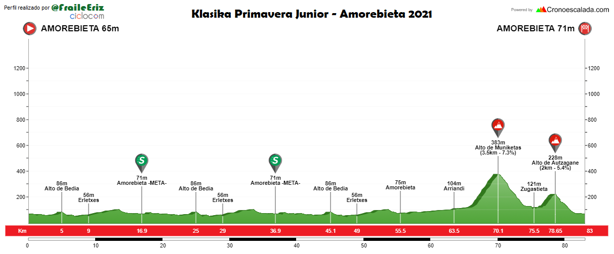 Este sábado 3 se celebra en Amorebieta (Bizkaia) la 57ª edición del Premio Primavera para la categoría de júnior. La carrera arrancará a las 10 horas y tendrá un recorrido de 80 kilómetros. Los altos de Muniketas y Autzagane en los últimos 13 kilómetros decidirán el vencedor sobre las 12:28 horas.