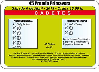 El pasado sábado se celebró en Amorebieta el 45 Premio de Primavera para categoría cadete sobre una distancia de 42 km que los corredores realizaron a una media de 42,32 km/h. Iván Bonilla fue el vencedor por delante de Rubén Fandiño y Pablo Fernández.