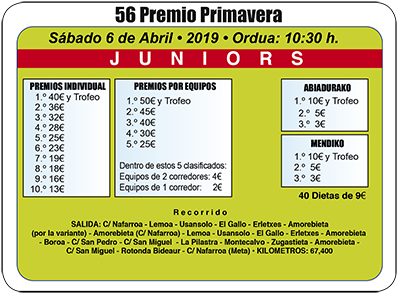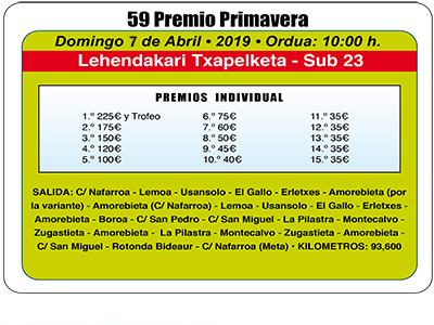 Este sábado 6 de abril se celebra en Amorebieta (Bizkaia) la 56ª edición del Premio Primavera para las categorías de juniors y la 45ª para cadetes. La primera arrancará a las 10:30 horas y tendrá un recorrido de 67,4 kilómetros y la segunda, a las 16 horas, sobre 42 kilómetros. Ambas bajo la organización de la Sociedad Ciclista Amorebieta, una de las entidades con más solera dentro del ciclismo vasco, y que servirá de preludio de la prueba profesional que tendrá lugar el próximo 14 de abril.