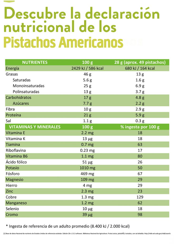 Los pistachos son un nutriente rico en antioxidantes, vitaminas, proteína y fibra. Un puñado de diario equivale a 49 pistachos, más rico y saludable que cualquiero otro fruto seco. Estan libres de colesterol y solamente contienen 1,5 gramos de grasas saturadas y 12,5 gramos de grasa saludables, provinentes de las grasas monosaturadas y la polinostauradas. Además, contienen una significante cantidad de potasio, 300mg, y 6gr de fibra.