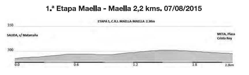 Este año 2015 la prueba se realizará los días 7, 8, 9 y 11 de agosto, comenzando con una contrarreloj individual y dejando una jornada de descanso el día lunes 10 para que los corredores repongan fuerzas. La contrarreloj individual será de 2,2 kilómetros en la localidad deMaella, sobre un circuito urbano sin apenas desnivel. La salida del primer corredor se dará a las 18 h.