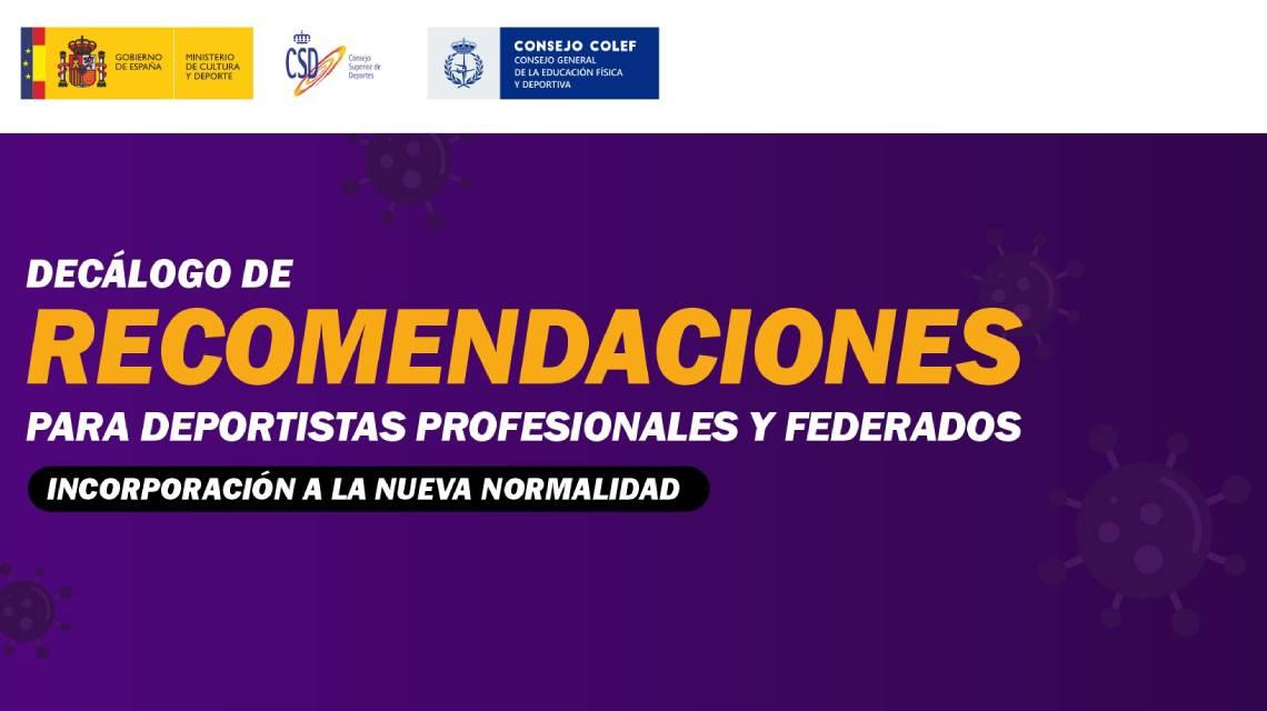 Por todo ello, y ante la puesta en marcha de la fase 0 del Plan para la transición hacia una nueva normalidad, a través de la Orden SND/388/2020, de 3 de mayo, en la que se retoman entrenamientos individuales de deportistas profesionales y federados/as y los entrenamientos básicos de ligas profesionales (ver Anexo II), el Consejo Superior de Deportes (CSD) y el Consejo General de la Educación Física y Deportiva (Consejo COLEF) han elaborado una serie de recomendaciones para deportistas, complementarias a las ya publicadas por ambas instituciones en días previos (práctica físico-deportiva al aire libre para población general).