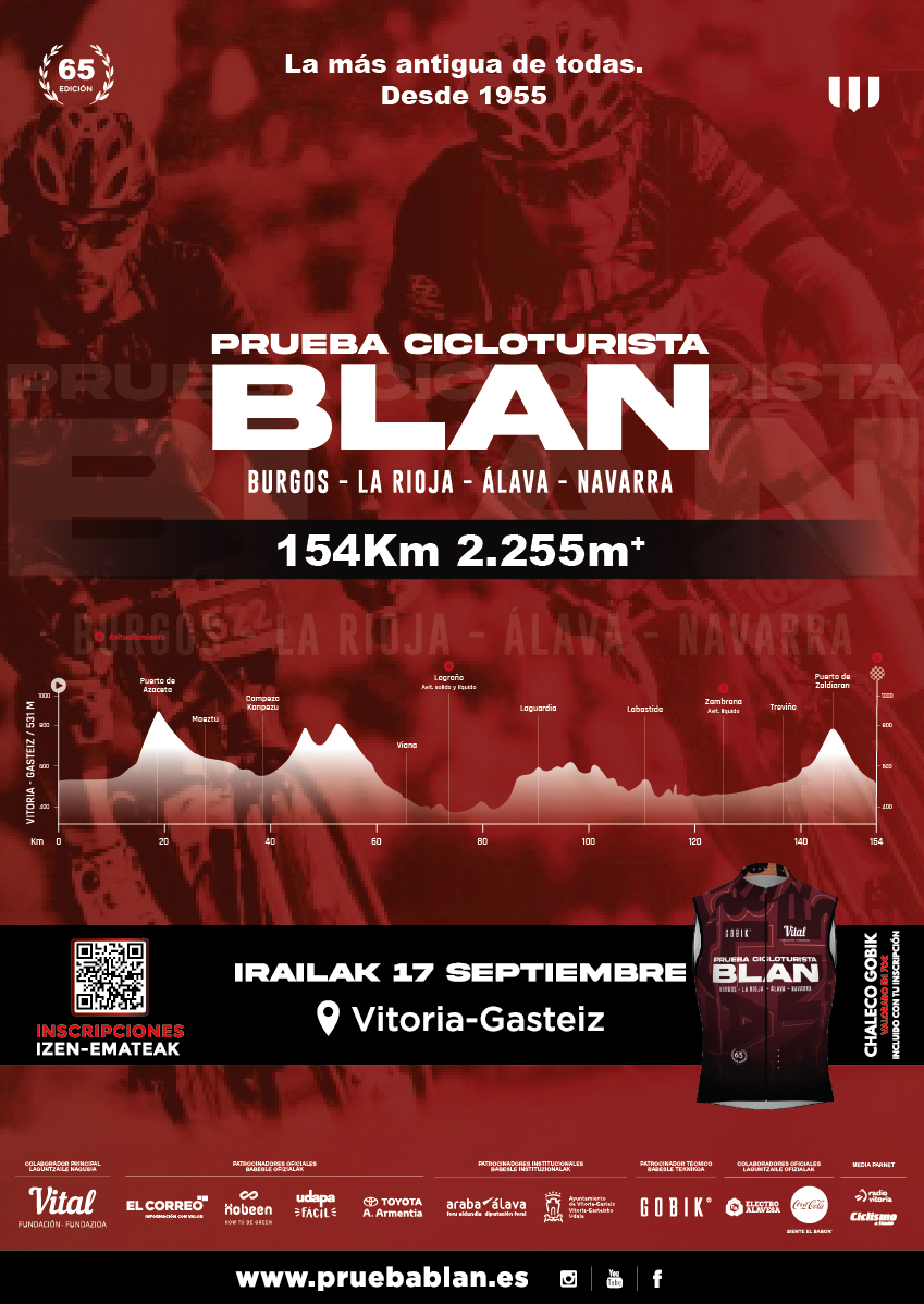 El sábado 17 de septiembre estará de vuelta la prueba cicloturista más antigua del país, Prueba BLAN. Ya suma 65 ediciones y dará su salida en Vitoria-Gasteiz.