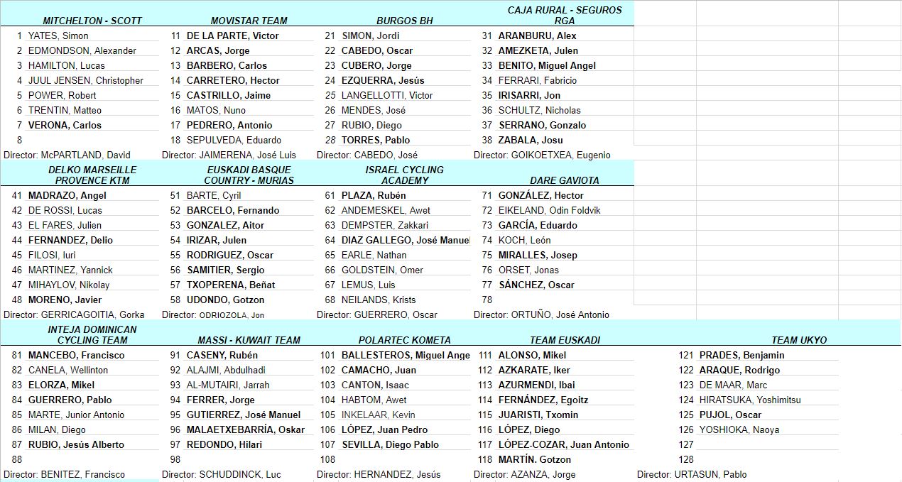 El británico Simon Yates (Mitchelton-Scott) fue el vencedor de la prueba hace dos años: «Esta será mi primera carrera desde el Giro de Italia. Tengo buenos recuerdos como ganador en 2016. Uno de mis lugares favoritos para competir en bicicleta es el País Vasco, es un lugar hermoso con aficionados extremadamente apasionados. Como equipo esperamos ganar la carrera y tenemos un equipo muy fuerte para hacer eso y buscaremos explotar nuestra fuerza. Para mí, este es el comienzo del camino hacia la Vuelta a España y el entrenamiento ha ido bien, pero nunca se sabe hasta la carrera, así que espero buenas piernas y también buena suerte».