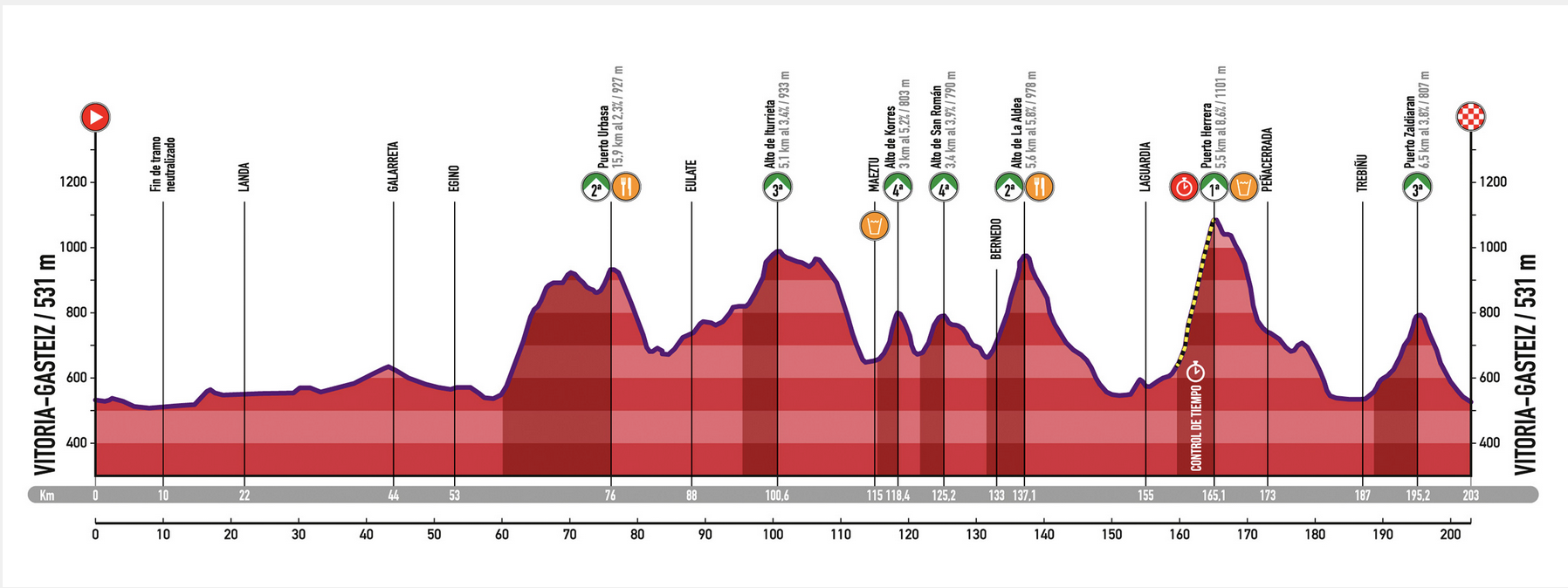 - Horario: Los controles de paso, estarán abiertos desde las 13:20 hasta las 15:25 horas desde el cruce de Leza (Km.159, 5). Fuera de ese horario, no se contabilizará el paso. El cierre de control de paso en la cima del Puerto de Herrera (Km. 165) será a las 16:00 horas, coincidiendo a su vez con la hora máxima de paso.