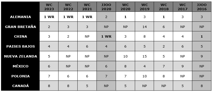 Y aunque ha sido una modificación importante, las selecciones que estarán en París no diferirán mucho de las que compitieron en Tokio, ya que repiten cinco (Alemania, China, Países Bajos, México y Polonia). La gran ausencia es Rusia, por los motivos de sobra conocidos, y una sensible baja ya que tiene corredoras en cantidad y calidad como para estar luchando por las medallas. Tampoco repetirán Lituania, un país lastrado por ese aumento de corredoras, y más tras la retirada de la mítica Simona Krupeckaite, ni Ucrania, que en las actuales circunstancias tiene muy complicado afrontar un programa de clasificación tan exigente como el olímpico. Algo de lo que puede dar fe Francia, que al final se quedó fuera, a pesar de haber apostado todo y hasta el final por estar en los Juegos de casa.