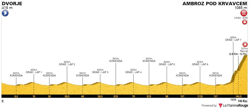 El recorrido consta de 145.8 kilómetros desde la localidad de Cerklje hasta la cima de Ambrož pod Krvavcem tras siete vueltas a un circuito prácticamente llano y la subida final de 8.1km al 7.9% de pendiente media. Entre los 61 participantes hay nueve ciclistas del World Tour: Domen Novak, Jan Tratnik, Luka Pibernki, Matej Mohoric, Grega Bole (Bahrain-McLaren), Jan Polanc (UAE-Emirates) y Luka Mezgec (Mitchelton-Scott), además de los citados Roglič y Pogačar.