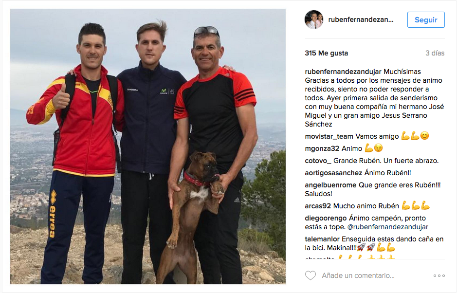 Rubén Fernández (Movistar) sigue en transición de llevar una vida absolutamente normal. Para ello aún le quedan tres semanas. El tiempo que los médicos le han recetado para recuperarse plenamente de su fractura de mandíbula tras caerse de su bicicleta el pasado 8 de noviembre cuando entrenaba en solitario después de salir de la convalecencia de su clavícula rota en la pasada Milán-Turín en la misma caída que le causó la misma lesión al también renacido Adriano Malori. Una ráfaga de viento, habituales en la periferia de Murcia, le hizo literalmente volar y dar violentamente con su barbilla en el asfalto que se rompió en tres pedazos.