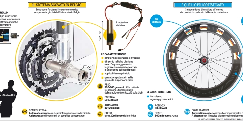 Si la información ofrecida hoy por el rotativo italiano la Gazzetta dello Sport es cierta, estaríamos hablando de una inversión increíblemente elevada para una familia en esta situación de ruina. Según nuestros colegas transalpinos, el sistema encontrado en la bicicleta de la corredora, que podría aportar una potencia extra de entre 50 y 500 watios (por un peso de entre 500 y 600 gramos) tiene un precio de 20.000 euros. Incluso, hablan el el diario italiano de otro sistema que estaría escondido en el interior de la rueda trasera y que tendría un coste de 200.000 euros. Evidentemente, y atendiendo a lo que sabemos de los Van den Driessche, un coste que evidencia que ellos no serían más que los conejillos de indias de alguien o de algunos que son los que, a todas luces, deben de ser los persrguidos ahora.