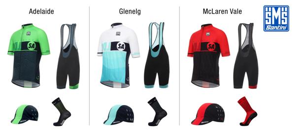 Además de los maillots «de» los profesionales, Santini ha confeccionado también una colección de uniformes diseñados «para» profesionales, para celebrar la carrera. Tres juegos completos (gorra, maillot, pantalón corto y calcetines, perfectamente conjuntados), cada uno dedicado a una etapa de particular interés deportivo del Tour Down Under 2017.