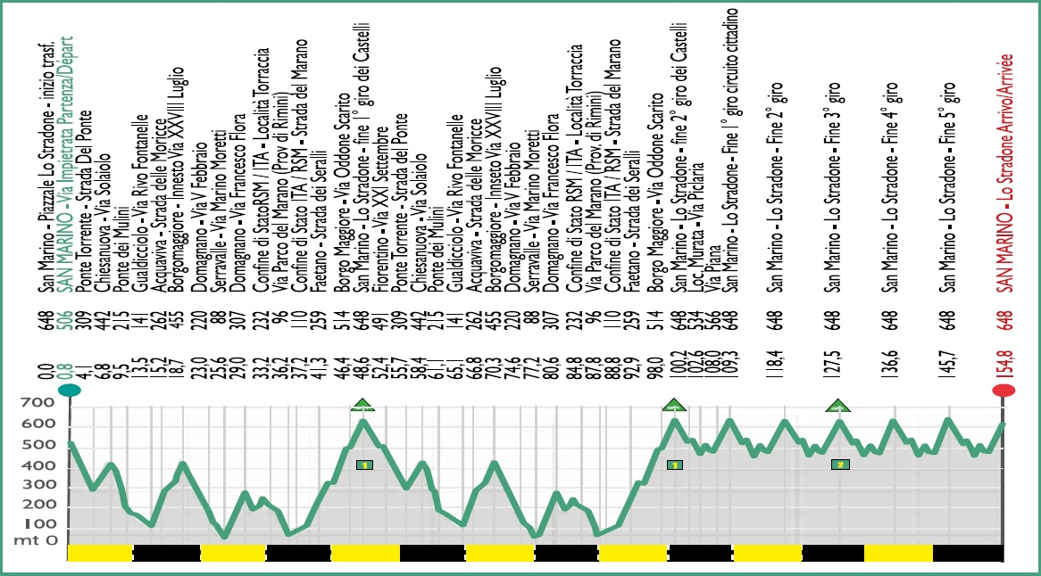 El día siguiente partirá también de Riccione, para la etapa que tendrá a su paso también el inédito paso por la República de San Marino. Tres KOM, el último de ellos situado a 15 kms de la llegada, parecen ofrecer un terreno ideal para una escapada, o para el intento de algún cazaetapas. En la penúltima jornada, la República de San Marino será aún más protagonista, ya que será tanto la salida como la meta de un día de 154 km que se desarrollará casi toda ella fuera del territorio italiano. Esta será también la etapa reina de la carrera, con un circuito final de 9,1 km, de los cuales los últimos 2,5 al 7% de media donde seguramente darán batalla los aspirantes al éxito final.