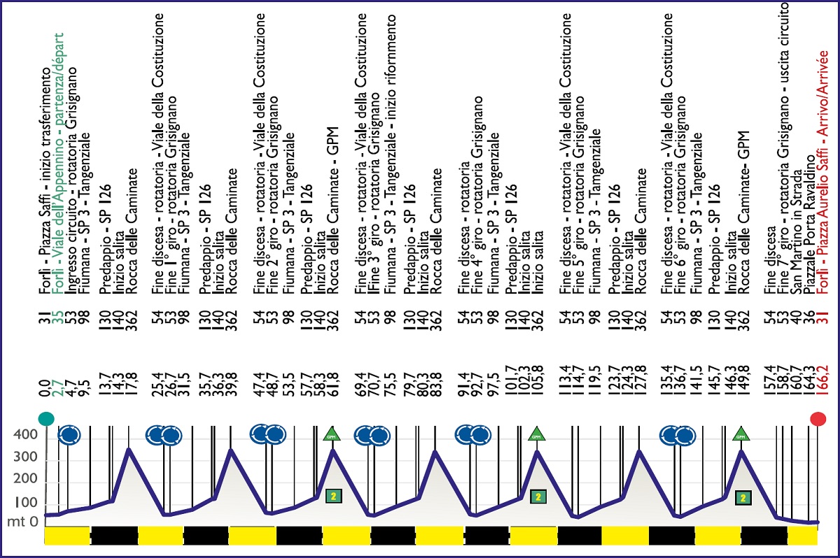 La última etapa será de nuevo en Forlì, con salida y llegada en la plaza Aurelio Saffi tras 166 km de carrera. El circuito con Rocca delle Caminate, que se repetirá siete veces, seguramente hará la selección, pero los últimos siete kilómetros llanos hasta la línea de meta también podrían animar algún retorno, yendo hacia un sprint con filas reducidas, al final del cual se formalizará también el sucesor en el cuadro de honor de Jhonatan Narváez, ganador el pasado otoño de la edición 2020 de la carrera.