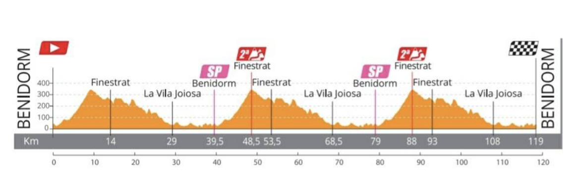 La etapa alicantina de la Setmana Ciclista Valenciana será la encargada de cerrar la segunda edición. Benidorm conocerá a la vencedora final de la carrera después de una jornada muy exigente de 118 kilómetros. El alto del Finestrat (2ª), que se subirá hasta en tres ocasiones, será el juez.