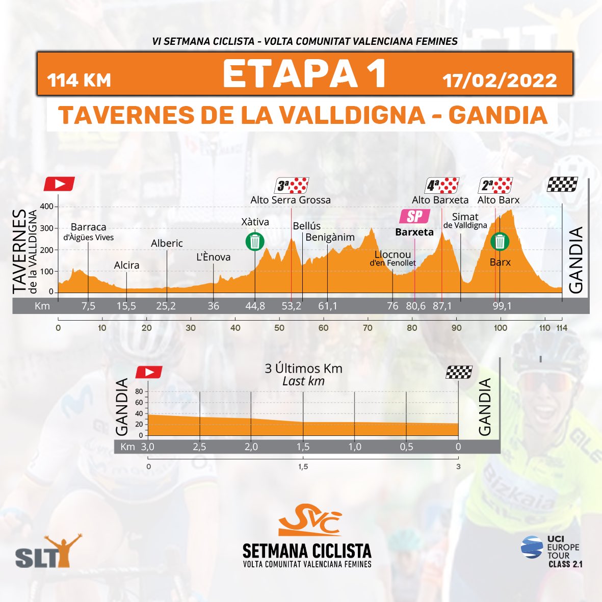 La primera etapa significará la primera oportunidad que tengan las ciclistas explosivas para alzar los brazos, puesto que se corona el Alto de Barx (2ª categoría) a falta de 15 km de la línea de meta, situada en Gandía. Por su parte, en el segundo día de competición se pueden desatar las primeras batallas desde lejos para alcanzar el liderato de la clasificación general, ya que en el kilómetro 13 las corredoras comenzaran a ascender el Alto de Confrides (1ª categoría), con una longitud de 20 km. No obstante, si en el terreno posterior se consigue recomponer el pelotón, se puede llegar a ver un sprint final en Cocentaina entre las ciclistas más potentes.
