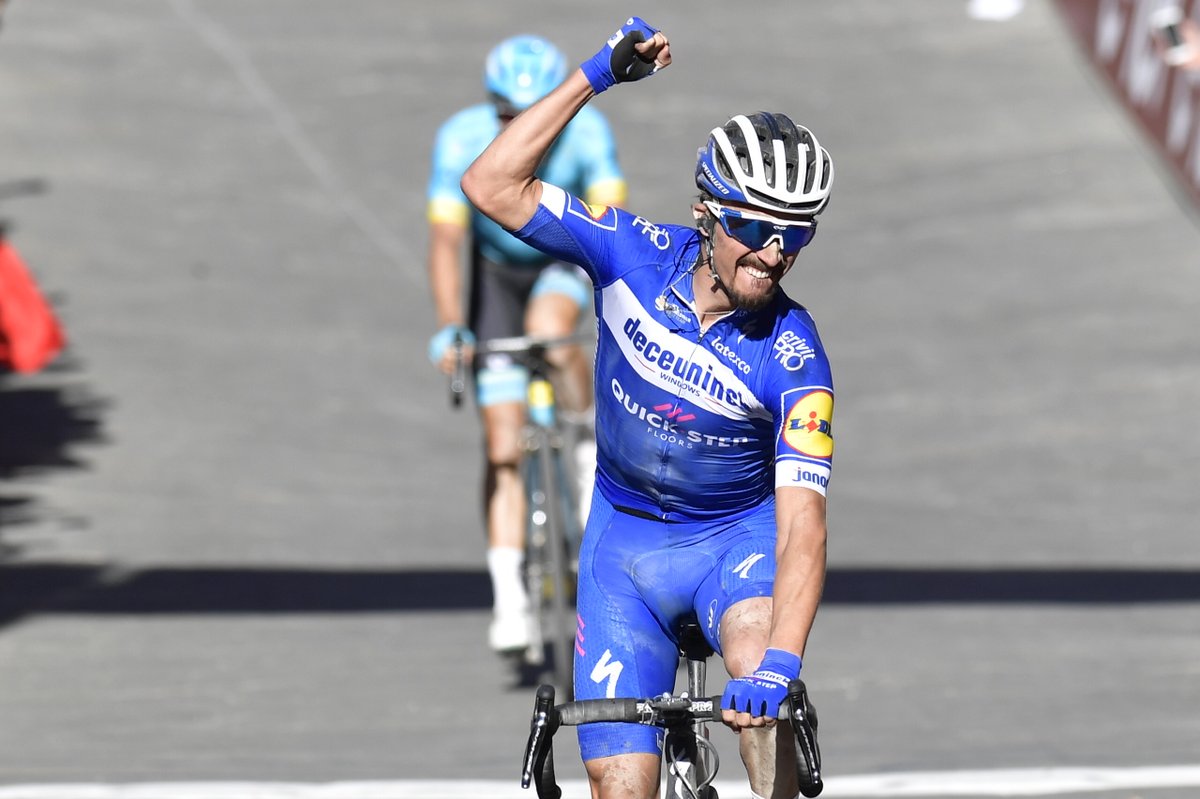 El crosser contactó con la cabeza de carrera al pasar bajo la pancarta del último kilómetro, pero estaba claro que, como ya le sucediera el pasado año, la cuesta final se le iba a hacer excesivamente dura. Así, el belga ni se molestó en levantarse del sillín cuando, a 400 metros de la línea de meta, Fuglsang aceleró tratando de sorprender a un muy atento Alaphilippe que no sólo hizo valer su mayor explosividad en ese terreno, sino que se aseguró el mejor posicionamiento al entrar primero en la última curva a izquierdas, un punto a partir del cual es prácticamente imposible ser rebasado.