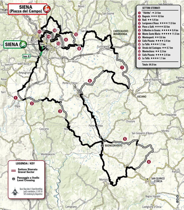 Estos cambios se traducen en una reducción significativa de la dureza acumulada, con 64,1 kilómetros de grava, lejos de los 80 del año pasado, y una distancia total de 201 kilómetros, frente a los 215 de la edición anterior. Pese a ello, el desenlace no sufre variaciones y volverá a concentrar la máxima exigencia, con el encadenado de los ya icónicos sectores de Monte Sante Marie, Monteaperti, Colle Pinzuto y Le Tolfe, estos dos últimos afrontados en dos ocasiones antes de la tradicional llegada a la Piazza del Campo de Siena, escenario de una de las metas más espectaculares del calendario ciclista.