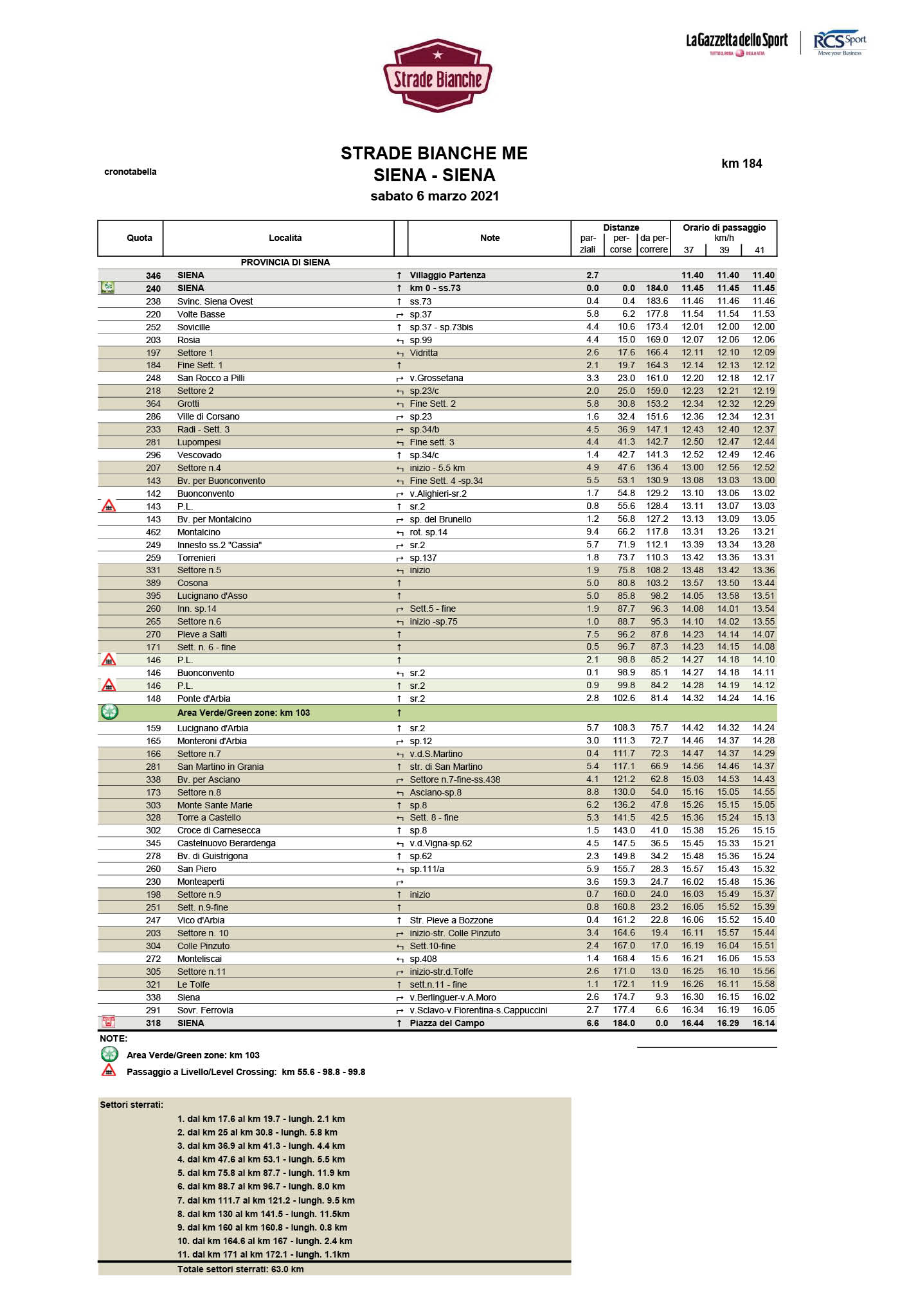 Como suele suceder en esta prueba, el pelotón abandonó Siena con muchas ganas de hacer la carrera dura desde el primer momento. Durante esos kilómetros iniciales se fueron sucediendo distintos ataques al frente del pelotón, pero ninguno de ellos consiguió abrir hueco hasta que, a falta de algo menos de cien kilómetros para la línea de meta, a punto de atacar el cuarto sector de tierra, Elena Pirrone (Valcar-Travel & Service) sí tuvo las fuerzas suficientes como para marcharse en solitario.