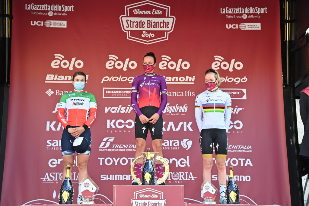 La Strade Bianche Donne ha dado hoy el pistoletazo de salida al Women’s World Tour con un recorrido de poco más de 130 kilómetros plagado de sus característicos tramos de sterrato, esa superficie que esta misma carrera se ha encargado, en su muy corta historia (con las de hoy, 15 ediciones masculinas y siete femeninas), de poner de moda en el ciclismo internacional elevándola hasta la misma cota de popularidad que los adoquines tan típicos de la primavera centroeuropea. La neerlandesa Chantal Blaak (Van den Broek de casada) se llevó el triunfo y el primer liderato del torneo de la UCI con Mavi García, mejor española en la 13ª plaza.