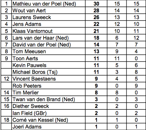 Evidentemente, tras imponerse en las dos primeras carreras puntuables para el Superprestigio, Sanne Cant sigue al frente de la clasificación general de este trofeo con 30 puntos. Por detrás se sitúa ahora la británica Nikki Brammeier (Boels-Dolmans) que, tras su tercera plaza de hoy suma 24 puntos y la belga Laura Verdonschot (KDL), que con 21 puntos supera en uno a Eley Van Loy (Telenet-Fidea) mientras que el top 5 lo completan, empatadas a 14 puntos, Lucinda Brand y Jolien Verschueren (Telenet-Fidea).