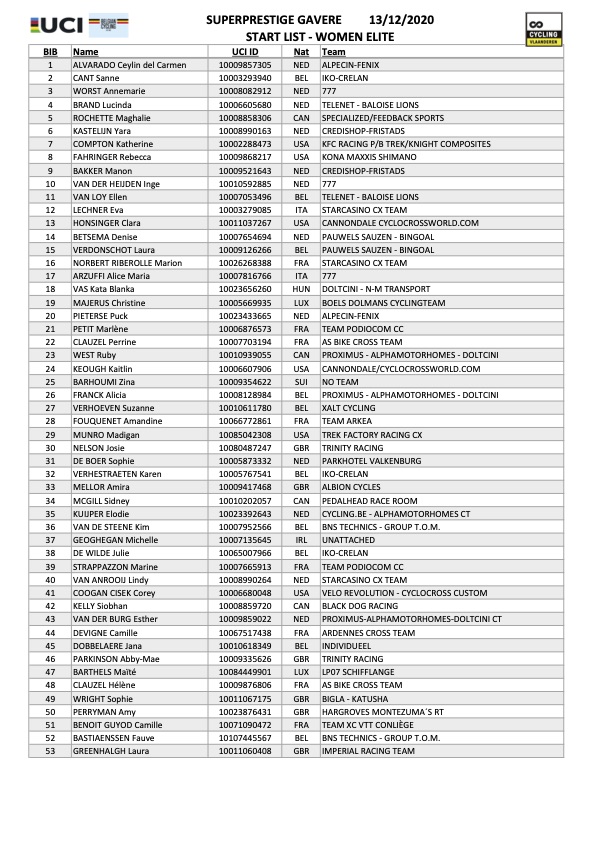 Llegaba Ceylin del Carmen Alvarado (Alpecin-Fenix) enrabietada a Gavere tras su fiasco de ayer en Amberes. La campeona del mundo y Lucinda Brand (Telenet-Baloise Lions) arrancaban en la fresca tarde belga empatadas a 71 puntos en la general del Superprestigio, al que ya sólo le restan dos de sus ocho pruebas, con la leona ocupando el liderato gracias al puestómetro y a sus tres triunfos consecutivos en Niel, Merkslpas y Boom y, como su compatriota, algo fastidiada por haberse visto superada en el Escalda por la también neerlandesa Denise Betsema (Pauwels Sauzen-Bingoal), que recuerda cada vez más a aquella corredora que explotó, casi de la nada, a finales de 2018 y que luego cayó en el ostracismo por ese extraño episodio del que la UCI decidió semiperdonarla con una sanción mínima.
